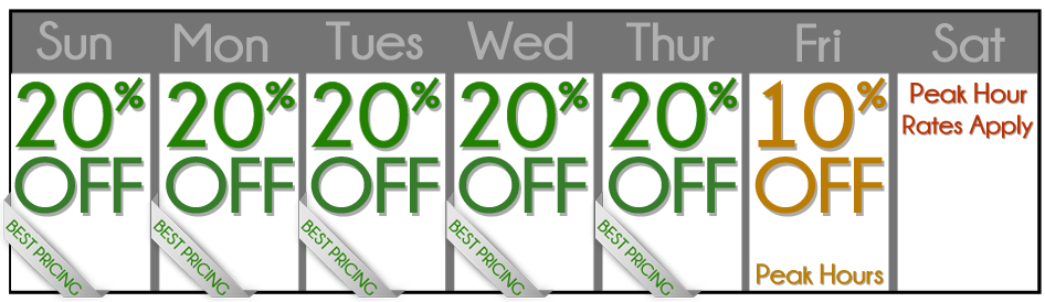 Unlike the other limousine service out there, we have a lot of discounts.  The chart below shows them.  The main listed rates are for "Peak" times.  "Peak" times are on Saturday.